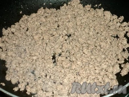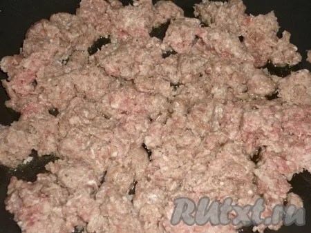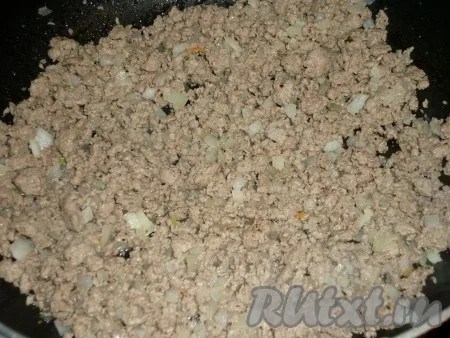 Обжариваем, постоянно помешивая фарш, до светлого состояния.